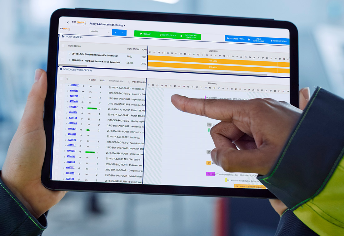 Rozwiązanie Ready4 Advanced Scheduling, w pełni zintegrowane z SAP, jest częścią platformy Asset Maintenance Management. To potężne narzędzie zapewnia łatwe w obsłudze, internetowe środowisko dla wszystkich branżowych operacji konserwacyjnych i serwisowych oraz planów prewencyjnych. Dzięki funkcji „przeciągnij i upuść” można szybko zarządzać wszystkimi działaniami lub zadaniami związanymi z harmonogramowaniem i alokacją zasobów w jednym systemie.